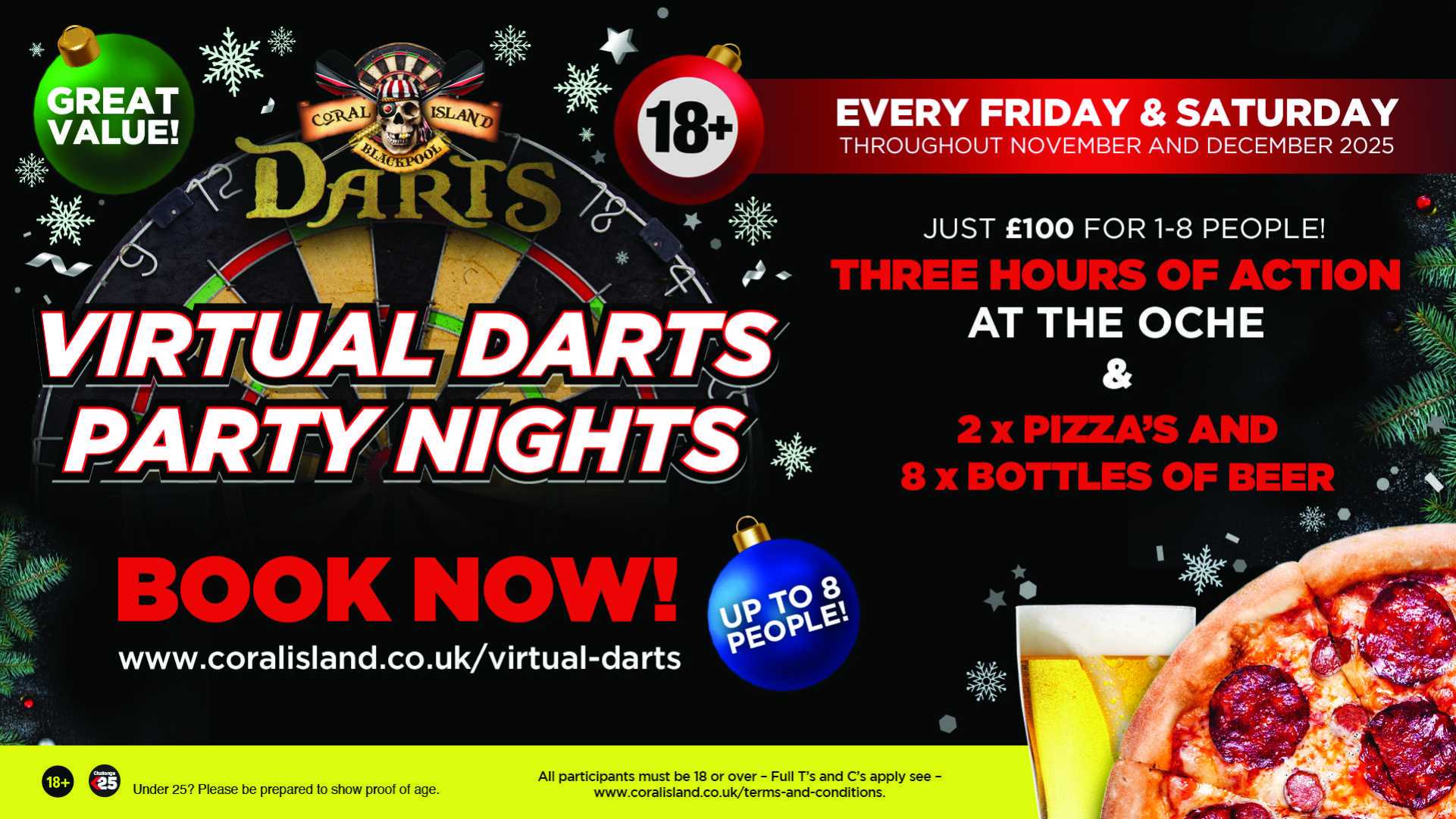 You MUST be 18 to book and play Virtual Darts at Coral Island Blackpool. The experience is located within the adult gaming area of the venue. ID will be requested for all players on entry to the venue.